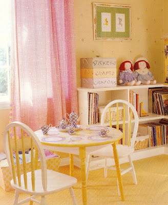 A Carlsbad, Claifornia, outdoor structure company called Tumbleweed built the playhouse, the fencing, and the arbor. The room is 10X12! I found this picture from Better Homes & Gardens in 2003! Adorable and cute! I love the sofa and chair!